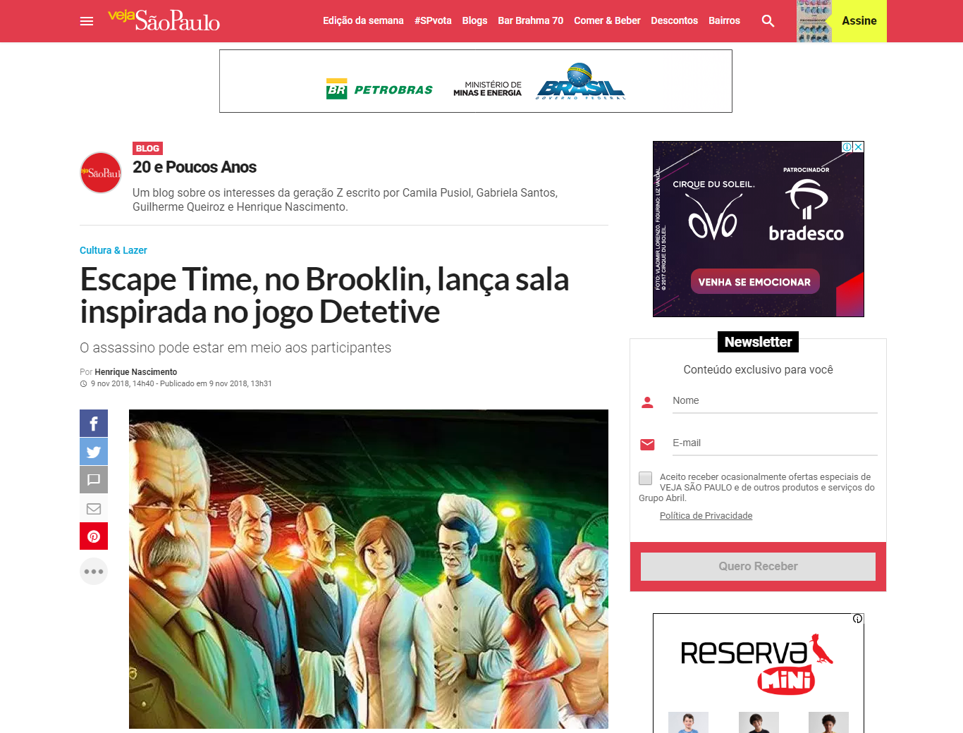 A Escape Time, em parceria com a Estrela, lançou a sala "Detetive do Caso 49", totalmente inspirada no clássico jogo de tabuleiro "Detetive". A equipe do blog 20 e Poucos Anos do portal da revista Veja São Paulo aproveitou para jogar e divulgar um review dessa novidade.